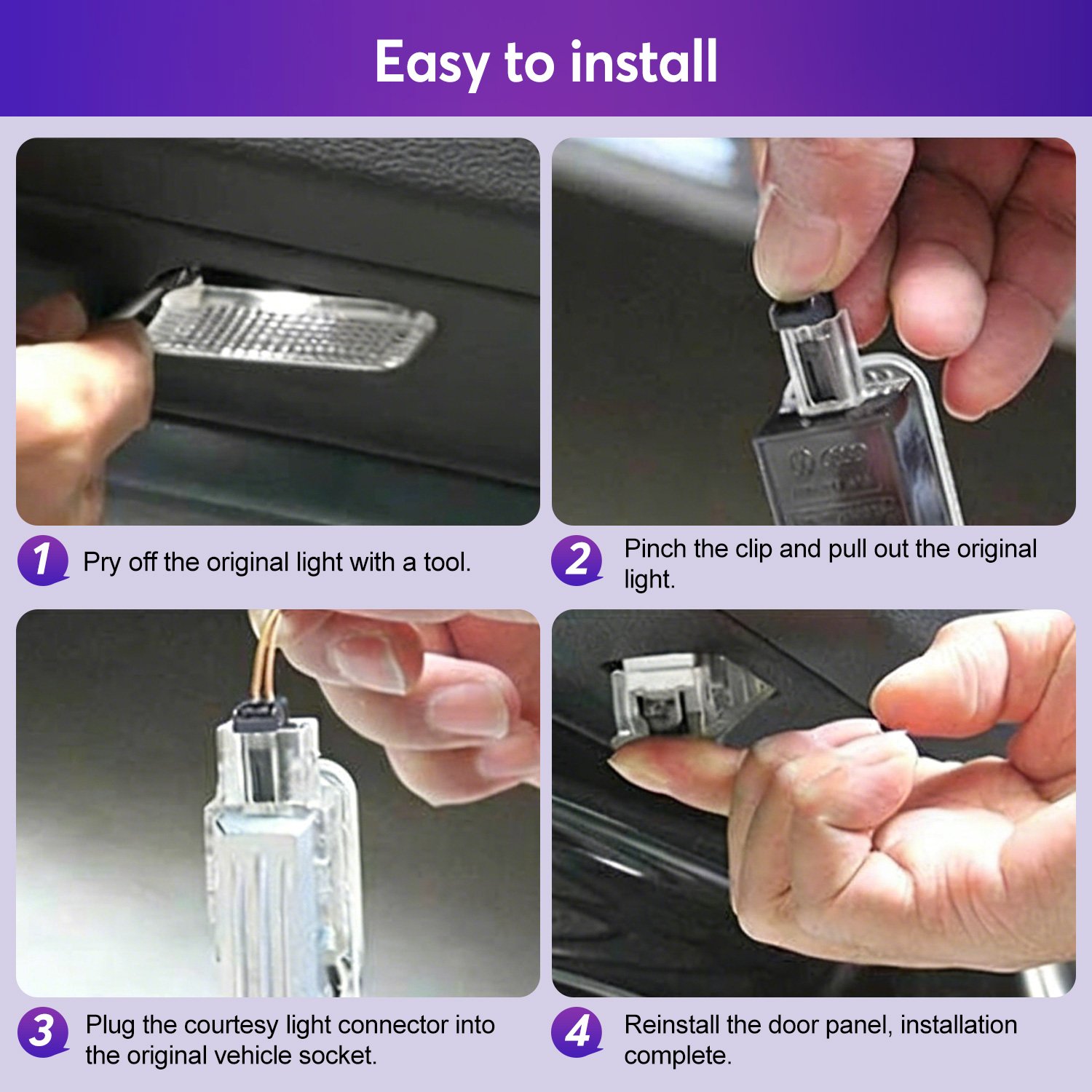 - Easy To Installl:Our welcome light adopt a dual socket design,plug and play, only need to replace old lights, no drilling, no modification or wiring, can be installed in just a few minutes