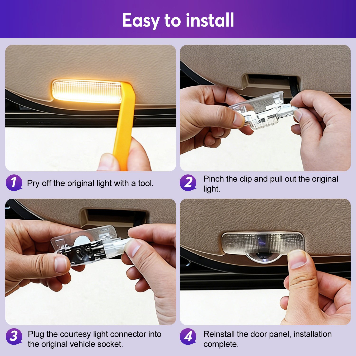 - Easy To Installl:Our welcome light adopt a dual socket design,plug and play, only need to replace old lights, no drilling, no modification or wiring, can be installed in just a few minutes
